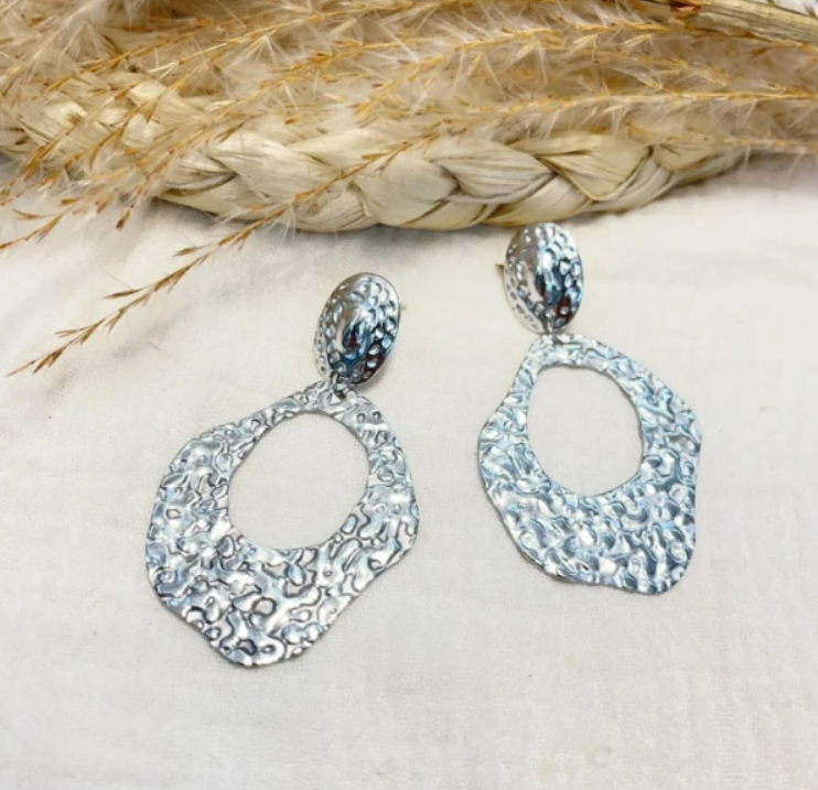 Adoptez un style moderne et tendance avec ces boucles d’oreilles argentées au design organique et martelé. Leur forme irrégulière et contemporaine crée un bijou unique, capable d’apporter du caractère et de la lumière à toutes vos tenues. La texture martelée reflète la lumière avec subtilité, offrant un rendu brillant et raffiné sans être ostentatoire.